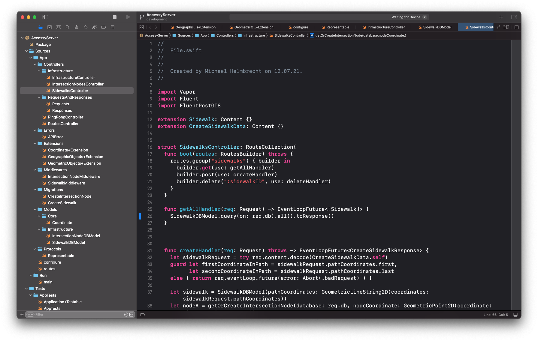 App und Serveranwendung sind beide in Swift geschrieben. Für den Server wurde Vapor verwendet. Da über 90% der blinden Menschen iOS als Betriebssystem verwenden, wurde sich hier für eine reine iOS Anwendung entschieden. Hier liegt ganz klar der Vorteil darin, dass beide System (Server und App) ein nahezu gleiches Datenmodel verwenden und die Entwicklung des Prototypen erleichtert hat.